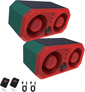 2pcs Sirène à capteur de Mouvement extérieur à énergie Solaire, 130dB x 2 Haut-parleurs, 13 Modes sonores intégrés Chiens aboyant et Tirs, avec télécommande pour arrière-Cour, Ferme,